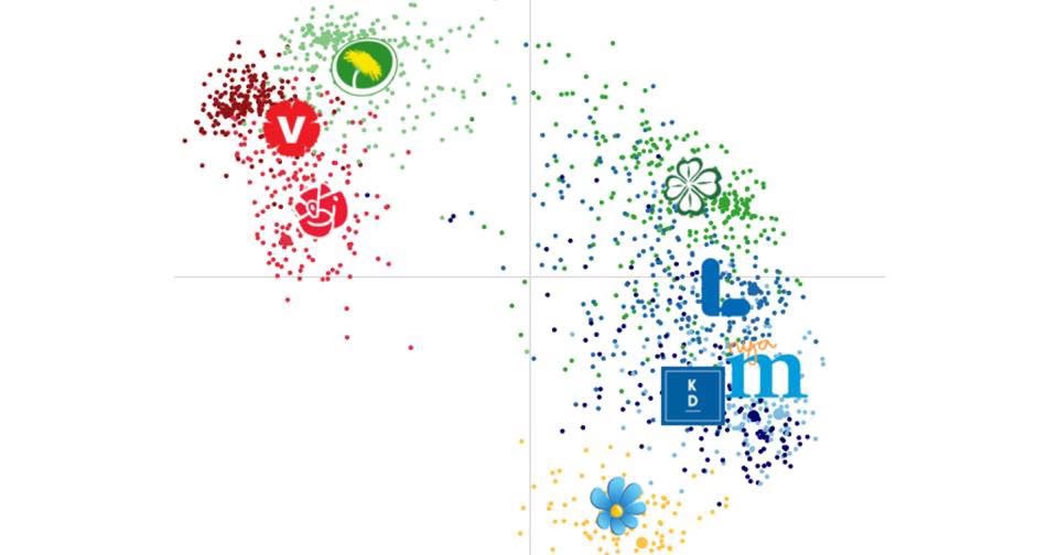 Enligt den traditionella höger-vänsterskalan är det Sverigedemokraterna som ligger närmast mitten. Sedan är det ett stort tomrum tills man kommer till Centerpartiet och Miljöpartiet på varsin sida om mitten tätt följda av Kristdemokraterna och Liberalerna till höger.